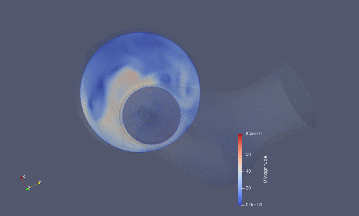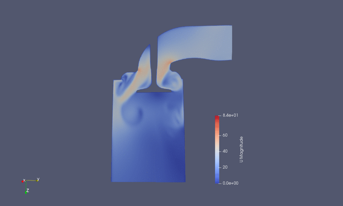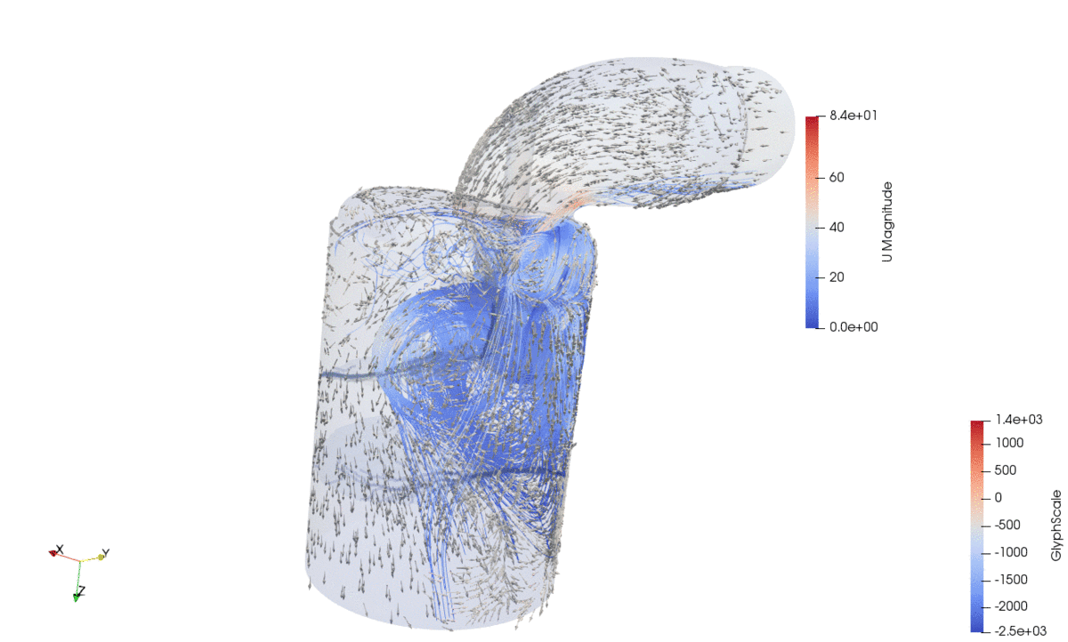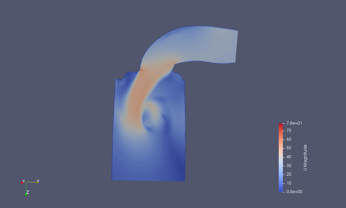 Ich habe in FreeCAD ein Modell eines Einlasskanals, Brennraum und Teil des Zylinders dargestellt. Da FreeCAD auch ein CFD-Modul besitzt, habe ich es einfach mal ausprobiert. Die Einströmgeschwindigkeit oben rechts ist 30 m/s, was im Laufe eines Ansaugvorgangs durchaus realitisch ist. Angezeigt wird die Strömungsgeschwindigkeit, die in der Strömungsmechanik oft als Geschwindigkeit U angegeben wird.