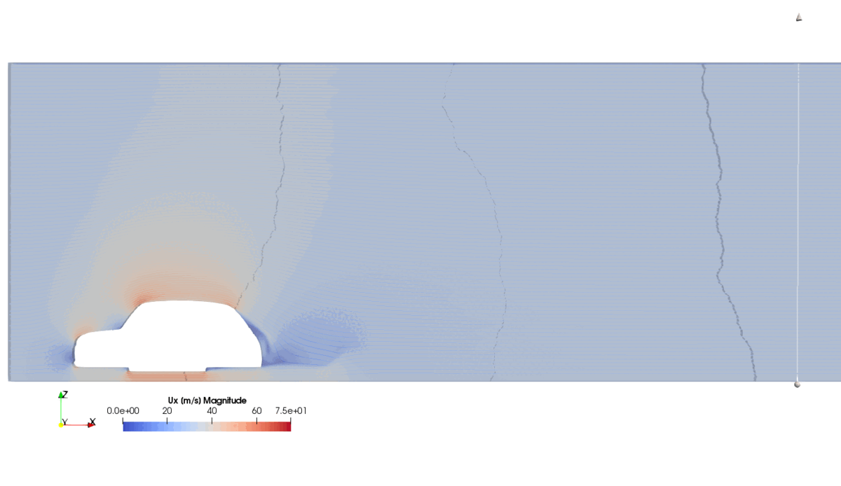 Die Laufzeit des Rechners um die Strömung zu simulieren hat viele Stunden gebraucht. Der Rechner kommt hier zu seiner eigentlichen Aufgabe, nämlich zu rechnen. Die Ergebnisse sieht man im Folgenden: